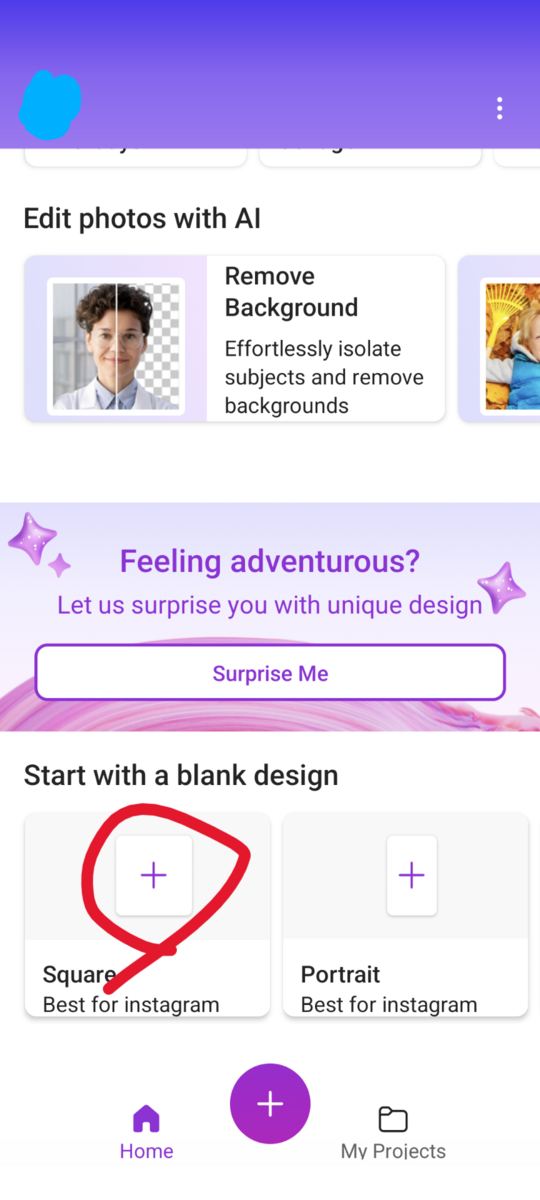 初期画面 下の方にスクロールすると、白画面が選べるので、サイズ選択してベースにします。